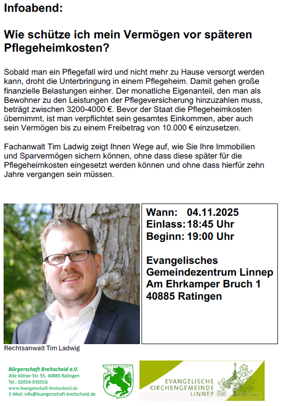 Wie bereits angekündigt, haben wir nach längerer Pause am 14. September 2023 wieder eine Vortragsveranstaltung durchgeführt, zu der alle Breitscheider Bürgerinnen und Bürger eingeladen waren. Rund 40 Personen sind der Einladung gefolgt. Fachanwalt Tim Ladwig hat nicht nur die Erbfolge und die Einflussnahme darauf amüsant präsentiert, sondern ist auch auf Fragen des Publikums eingegangen. Nach der Veranstaltung stand Herr Ladwig auch noch für Einzelfragen zur Verfügung. Nach dieser erfolgreichen Veranstaltung werden sicherlich weitere Veranstaltungen folgen.
